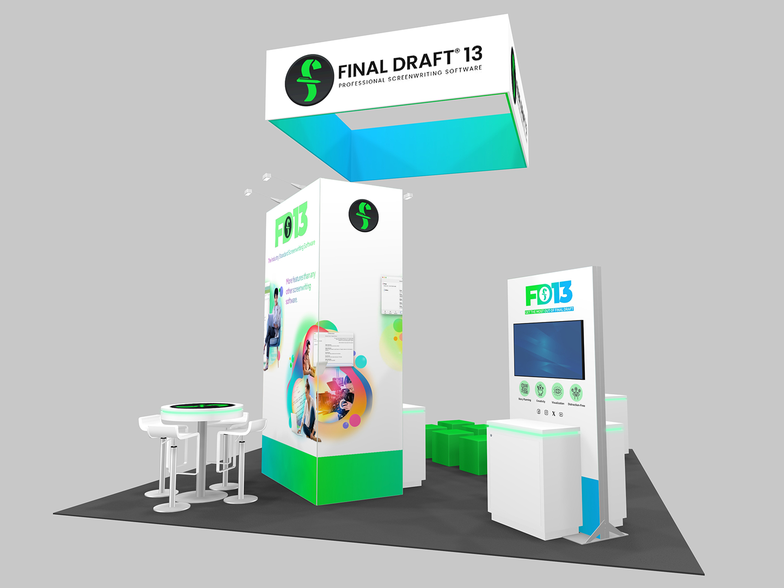 Gravitee One-Step Island Exhibits. When you choose a VK-5166 Gravitee Island, you get a contemporary display with large graphics, practical accessories, and mostly tool-less assembly. The full-size panels slide together with attached connectors, whether flat or curved. Most islands pack in one or two crates, saving you on freight and drayage (material handling). And assembly takes about half the time of a traditional custom exhibit. The VK-5166 features an open floor plan, perfect for one-on-one meetings or group presentations The 12 ft. high storage closet ensures your valuables are safe and that the booth space is clean and unclutter throughout the show. And then there's the overhead hanging sign... a must have for any island at a large trade show where you want to be seen.
